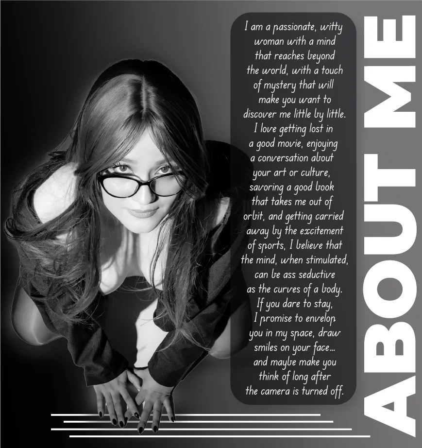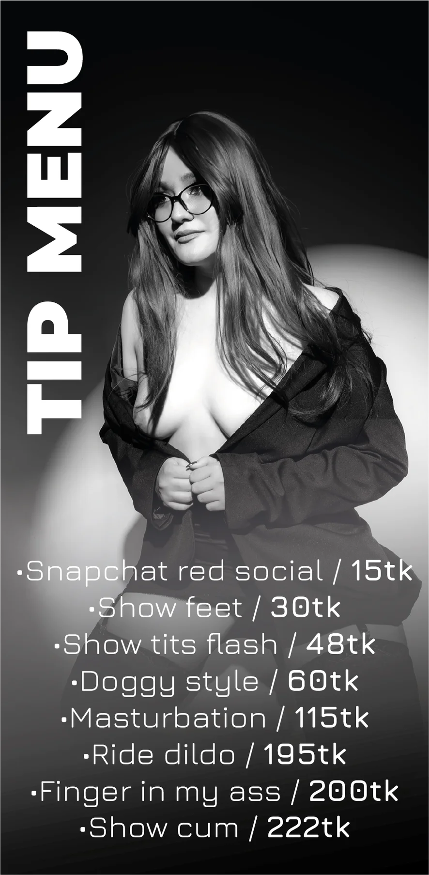 Zezadu, Plácání po zadku, Erotický tanec, Velbloudí palec, Špinavá mluva, Podpatky, Talk about anything, Prstění, Dildo nebo vibrátor, Striptýz, Roleplay, Orgasmus, Olejová show, Juegos anales, control domi, Deepthroat, Ženský výstřik, Hardcore